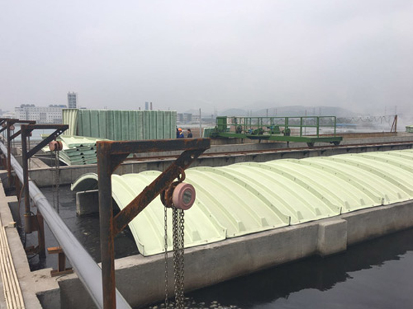 3、輕質(zhì)高強、安裝方便:玻璃鋼集氣罩比重僅為鋼制品的1/3至1/4,固化程度高,載荷負重大,強度高,適用于大跨度池體,同時蓋板可分為若干小塊,便于運輸、安裝。